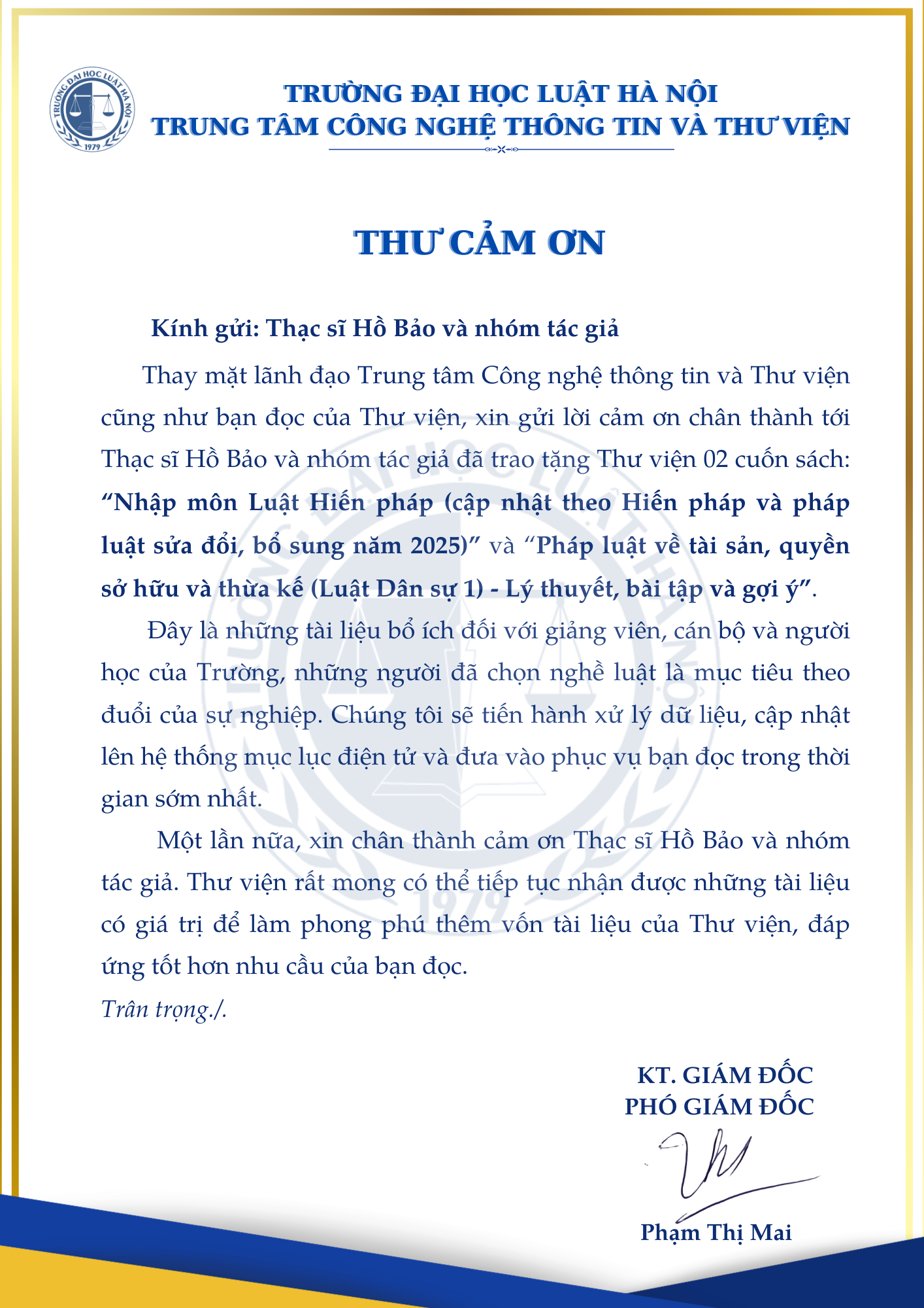 Thư Cảm Ơn tới tác giả gửi tặng sách Trung tâm Thông tin Thư viện Trường Đại học Luật Hà Nội