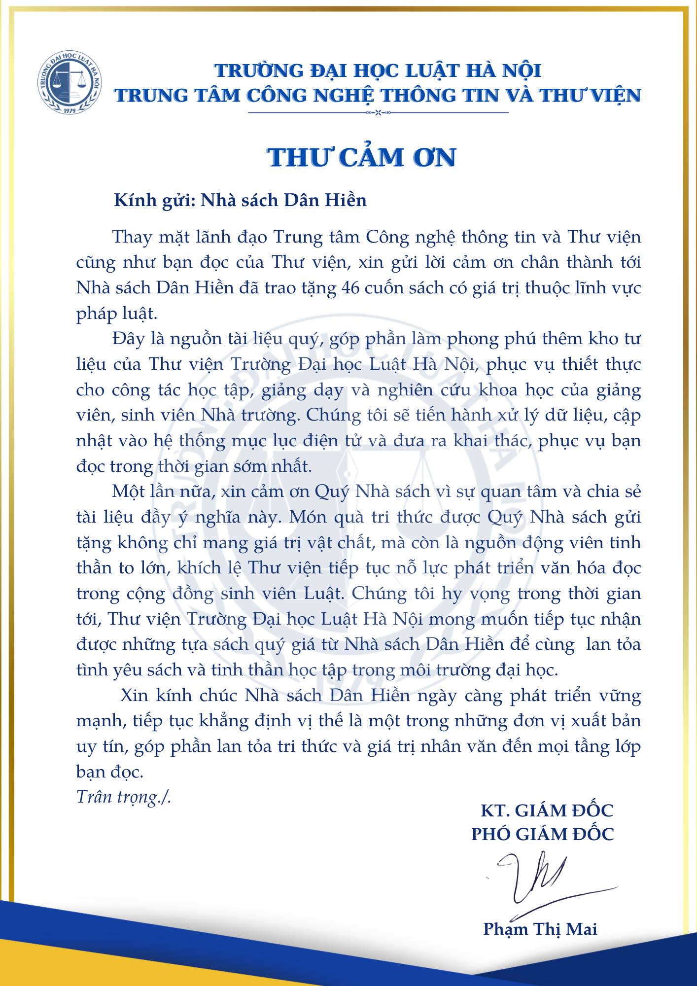 Thư Cảm Ơn tới nhà xuất bản gửi tặng sách Trung tâm Công nghệ thông tin và Thư viện Trường Đại học Luật Hà Nội