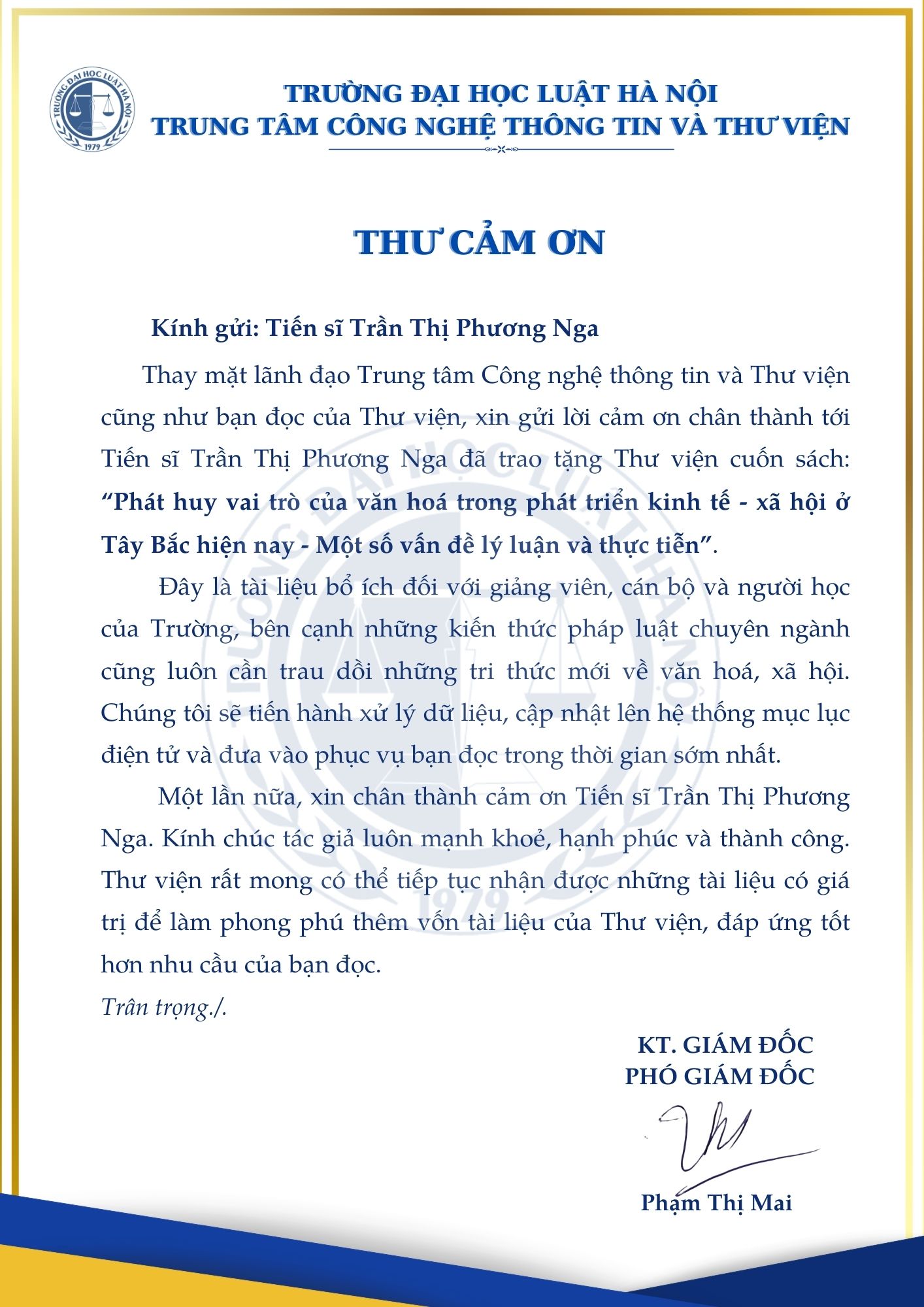 Thư Cảm Ơn tới nhà xuất bản và tập thể tác giả gửi tặng sách Trung tâm Công nghệ thông tin và Thư viện Trường Đại học Luật Hà Nội